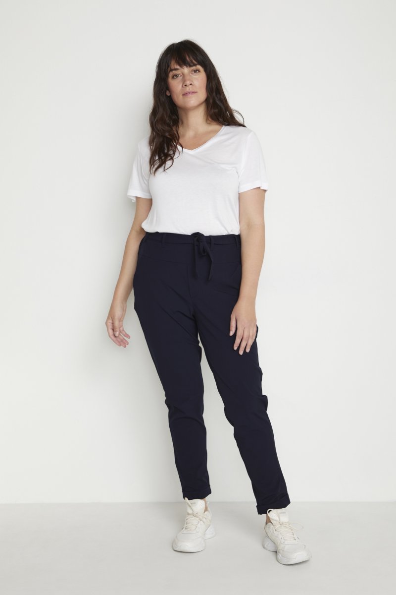 PantalonDisponible en tailles 42–56De la marque Kaffe CurveFabriqué en 68% polyester, 28% viscose et 4% élasthanneCoupe classiqueCouleur marineCliquez ici pour afficher le guide des tailles