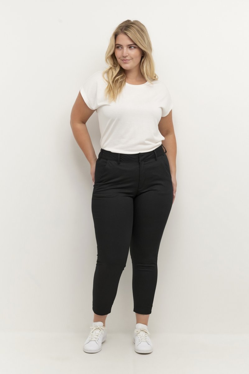 Pantalon chinoDisponible en tailles 42–56De la marque Kaffe CurveFabriqué En 38% Polyester, 30% Coton, 30% Viscose Et 2% ÉlasthanneCoupe classiqueCouleur noireCliquez ici pour afficher le guide des tailles