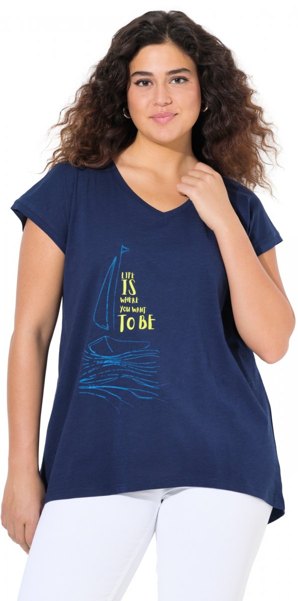 Ulla Popken Half-Sleeve A-line V-Neck Boat Pattern T-Shirt Ink Blue