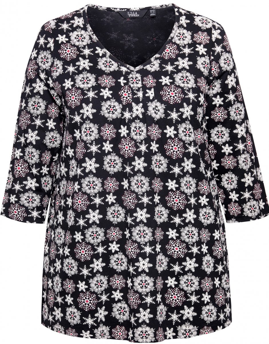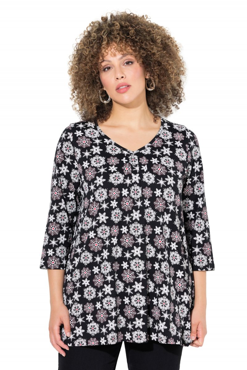 Ulla Popken Snowflake Print 3/4 Sleeve A-Line Tee Black